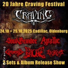 Am 24. und 25. Oktober 2025 lädt die Melodic-Death-Metal-Band Craving zur ultimativen Jubiläums- und Release-Show ins Cadillac Oldenburg ein.Einlass jeweils ab 19:30 UhrAm Freitag wird es brachial, denn CimaeriC (Melodic-Death/Core) und SoulGrinder (Death-Metal) werden die Bühne zum Beben bringen!